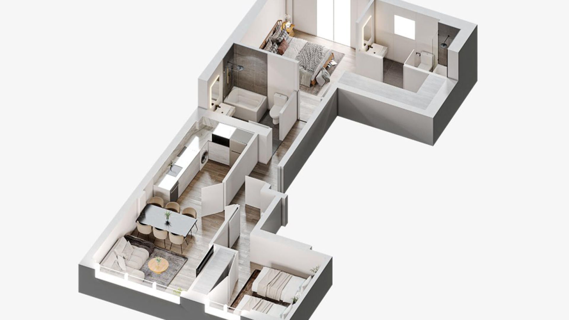 Esta vivienda es el Bajo A de 2 dormitorios con 77 m2 construidos.