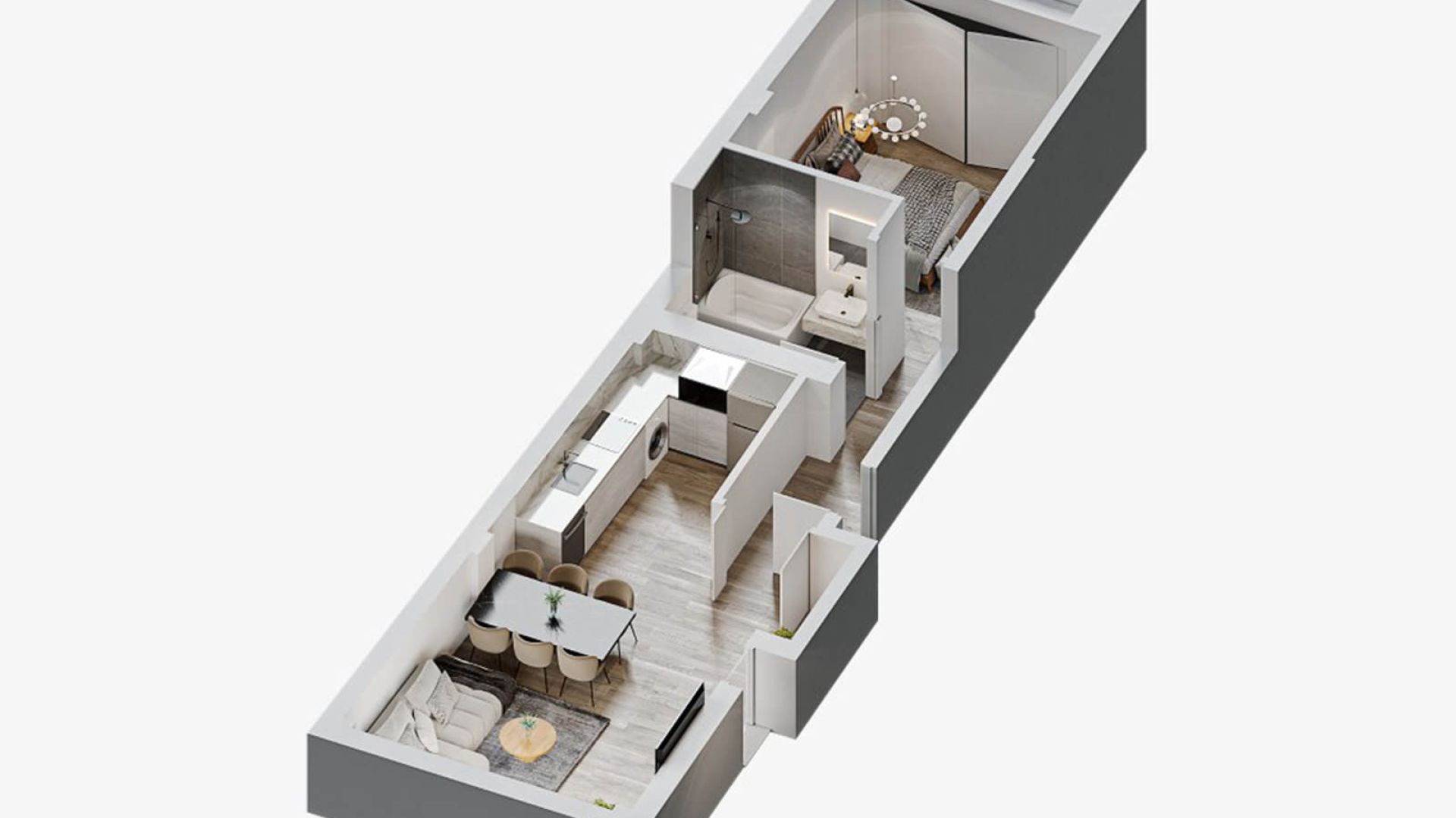 Acceso al interior de la vivienda a través de un hall de entrada y un pasillo distribuidor. Se ha diseñado un salón_comedor_cocina en fachada principal con luces a cubierta y con salida lateral a una terraza de 5,48 m2. Desde el distribuidor, se tiene acceso a un baño general interior para la vivienda.